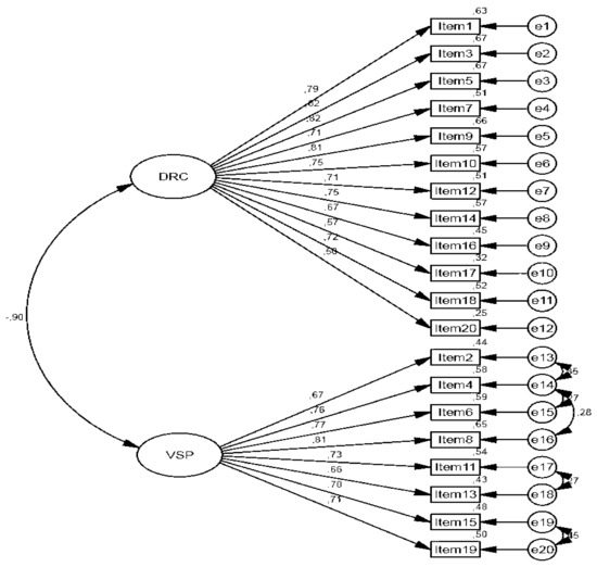 The covariance between DRC and VSP was −0.90, and the result was statistically significant. The Figure 2 displays the factor structure and items loadings on the factors. High errors were connected (e13–e14, e14–e15, e14–e16, e17–e18, and e19–e20).