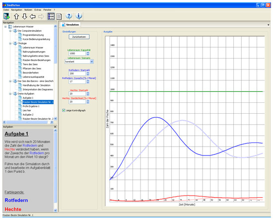 Screenshot of the computer simulation in the computer program ‘SimBioSee’. The navigation bar to the left contains linked headlines to further information pages presented on the right side. A field on the left, below the navigation bar, contains an assignment. The simulation outcome on the right side shows the number of the fish species at the indicated time. The red graph represents the number of predators (pikes) and the blue graph the number of prey (rudds). Graph modifications can be executed by changing the given parameters presented on the left side of the diagram. One can directly compare the simulation outcome to the lighter-colored initial conditions of the graphs.