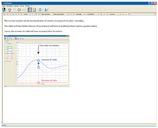 A desktop or a laptop-based computer program, including a computer simulation operated by keyboard and computer mouse, was developed and tested for the study. Prior to developing the computer program, twenty-eight biology teachers were interviewed with regard to the biological content. Based on their statements, the water-ecological computer program ‘SimBioSee’ was developed comprising domain specific fundamentals as well as a computer simulation on the predator–prey relationship between the two endemic fish species ‘pike’ and ‘rudd’ [84]. The computer program comprises an introduction with a manual, particular information pages, and a worked-out example. The information pages are used as a kind of interpretative support [57], permitting learners to have a permanent access to (water) ecological fundamentals during the interaction with the computer program with the aid of a navigation bar and appropriate linked headlines. Furthermore, worked-out examples are integrated in the computer program.