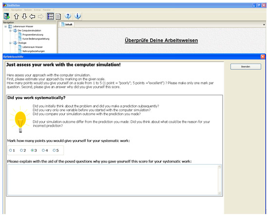 It has been proposed that self-reflective tasks can effectively support self-regulated learning. A concrete method of improving awareness, such as reflective self-assessment, shows positive effects on knowledge acquisition [75]. Learners were asked to reflect on their own and their classmates’ inquiries based on provided criteria after having completed computer-simulated experiments [75]. The method of reflective self-assessment supported learners in the self-reflection phase [79,80] and shows positive effects with regard to learners’ knowledge gain.