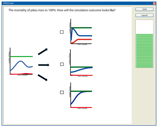 Each item of the ‘SPEED-test’ consisted of a question with regard to a change of a value from an initial situation. The initial situation given in each item was displayed on the left side of the computer screen as an image containing a diagram. This diagram stayed the same for each item. Next to the initial situation and in the middle of the screen, the response part presented consisted of three possible (post)situations to be anticipated by the learner via mouse click. Each item contained one correct answer. The initial situation and three possible outcomes were displayed as simplified simulation graphs of the computer simulation ‘SimBioSee’ with its two relevant curves showing the number of fishes as well as the line illustrating the biotope-carrying capacity. In addition, a running time scale displayed on the right side of the computer screen was used to trigger time pressure to encourage learners to give answers as quickly as possible. Learners had a maximum of 20 s to answer an item. If a learner did not answer an item during this time span, the next following item was displayed on the computer screen automatically. If an item could not be answered, a ‘next’-button located in the computer program on the upper right side of the computer screen offered the learner the possibility to continue to the next item. Before learners started the ‘SPEED-test’, they were introduced to the program and had the chance to practice the interaction with the test instrument and the item format with test items. Test items were similar to items for assessing intuitive knowledge, but their results were not been taken into account.