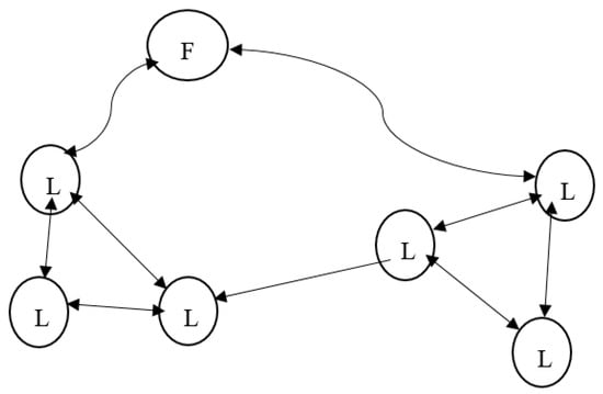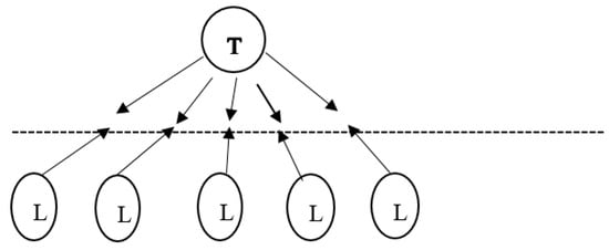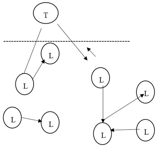 This example depicts a social situation in which the teacher allows discussion and mutual help between learners. Practical work would be an occasion for implementing this type of situation. The letters “TF” in the diagram indicate that the teacher now begins to assume the additional role of facilitator. The situation may be described as task- and learner-centred, and as one beginning to show a cooperative structure (see Figure 2).