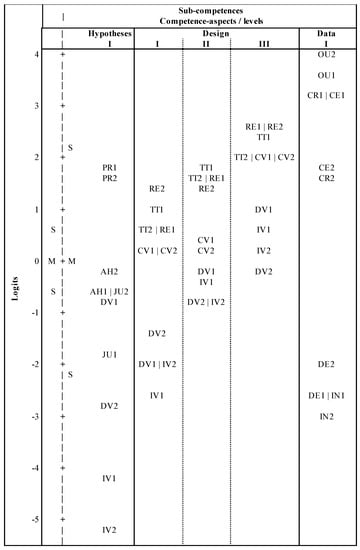 In Figure 3 the difficulties of each competence-aspect are provided and (to maximize the clarity of this figure) only the person abilities mean and standard error are indicated by “M” and “S” on the left-hand side of the scale. The items of the Wright Map are organized as a function of SIC, its sub-competences (“hypothesis”, “design” and “data”) as well as competence aspects (e.g., “independent variable”, “dependent variable” or “justification”). Thus, for example, the test items of the sub-competence of “generating hypotheses” are presented in the first column from the easiest item at the base of the map to the most difficult item at the top of the Wright Map. The item measures used in this Wright Map are Rasch-Thurstone thresholds [66]. The thresholds represent 50% chance of persons at the height of that aspect to be rated at that aspect [60]. This means that a person who has an ability of zero has a 50% probability to be rated 1 at an aspect with threshold zero. For competence aspects with positive measures (e.g., PR2), probabilities decline, for items with negative measures (e.g., AH2), probabilities rise, accordingly. The sub-competence “analyzing data”, on the right side of the map, is evaluated in the same manner. For polytomous aspects (sub-competence “designing experiments” in the middle) there were three different levels of quality (Table S3). The 50% probabilities of being rated at a specific level are represented in the Wright Map. Hence, the competence aspects of the sub-competence “designing experiments” are displayed three times in the map, once for each level. That means that a person who has an ability of zero would have a slightly more than 50% probability of being rated 2 at aspect DV (Dependent Variable) (Level 2), an even greater probability of being rated 1 (Level 1) and a probability less than 50% of being rated 3 (Level 3).