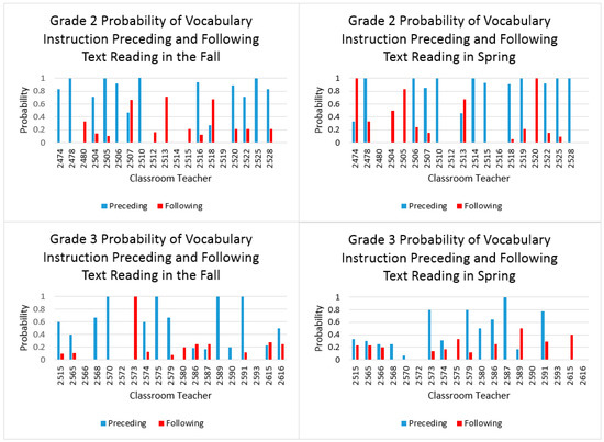 The few studies that have examined the timing of vocabulary activities within reading lessons have focused on the need for extended opportunities to learn and use selected words [35,36]. Thus, we were interested in better understanding when teachers taught vocabulary activities during their literacy block (e.g., before or after text reading). We evaluated the likelihood that vocabulary activities preceded and followed text reading in both 2nd and 3rd grade, and we found that there was a relatively strong probability that teachers taught vocabulary activities before reading a text at both grade levels. This finding is not surprising as most comprehensive reading programs encourage teachers to familiarize students with words prior to reading the text. As part of the curriculum, teachers might review specific words, gauge students’ understanding of the word meanings, and provide definitions—all before reading a text.