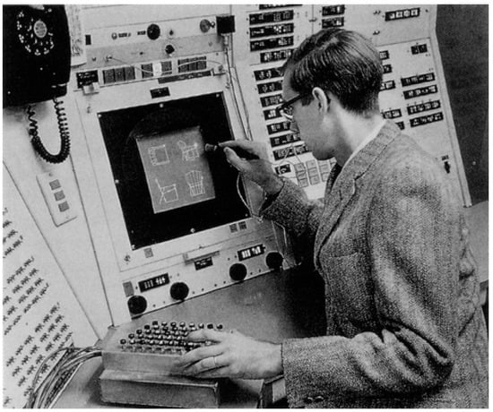 According to Reference [23], “in 1960, Ivan Sutherland, a brilliant student supervised by Claude Shannon (inventor of the theory of information that forms the foundation of digital communications), used the combination of the TX-2 and the light pen to create the seminal “Sketchpad” program. Sketchpad let a designer sketch shapes, which the computer would then turn into precise geometrical figures. It was the first computer-aided program and remains one of the most expressive ones.” [23] (p. 41). In his seminal paper “The theoretical foundation of computer-aided architectural design”, the author of [24] argues that the sophistication of a project depends on the development of a production unit with a computer–graphics interface.
