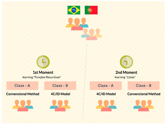 Each class was divided into two groups, which gave rise to four subgroups: Two in Portugal (G1 and G2) and two in Brazil (G3 and G4). In the first phase of the experiment, the students of the subgroups G1 and G3 learned the curricular component of programming called “Recursive Functions” in Python, based on the instructional model 4C-ID. The other subgroups (G2 and G4) performed the same curricular activities using the conventional teaching method. In the second phase, the students from the G2 and G3 switched to the 4C-ID instructional method and developed the activities of the curricular component “Lists” in Python, to avoid the Hawthorne effect (see Figure 2). The data used in this study were collected in the pretest.