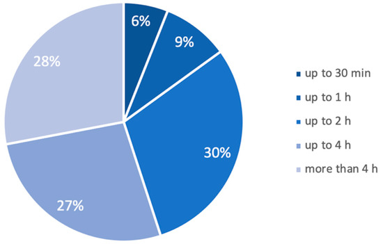 With regards to the question of daily time of internet use, 30% said they used up to 2 h a day, followed by 28% of students who said they used more than 4 h; 27% said they used up to 4 h a day. The other times of use can be seen together in Figure 3.
