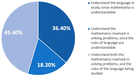 For 45.5% of the subjects, understanding the mathematics involved in problem-solving and the rules of languages was the biggest challenge. For 36.4%, the greatest difficulty was understanding the language rules because mathematics did not pose problems for them. Only 18.2% said that understanding the mathematics involved in problem-solving was the biggest challenge since the rules of languages were understandable (Figure 4).