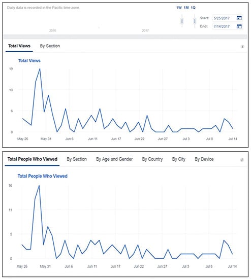 Content analysis of the pre-master open Facebook page, using Grytics []. (Top): total views per day of the course. (Bottom): number of people who viewed the page per day of the course.