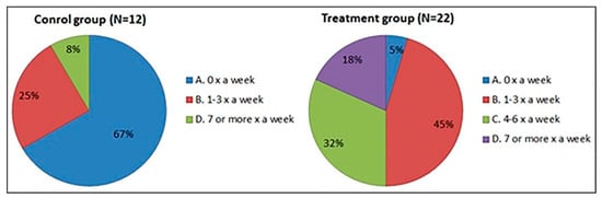 In the post-test, the participants in the treatment and in the control group were asked to indicate how often, on average, they accessed the Facebook course page or group. The majority (67%) of respondents in the control group indicated that they did not access it at all. In contrast, 95% of the respondents in the treatment group indicated that they had accessed the course Facebook group page at least once a week (Figure 4).