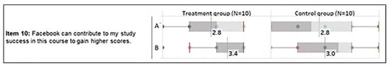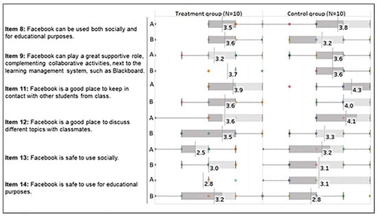 Students’ perceptions of the general use of Facebook, the comparison of the pre-test (A) vs. the post-test (B) for the treatment group (N = 10) and the control group (N = 10).