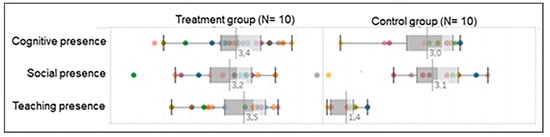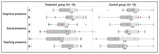 In their comprehensive literature review study Freeman et al. [] argued that poorly effective traditional lecturing in higher education should be abandoned in favor of the active learning approach that fosters students’ performance. Recently, Chiu & Cheng [] and Chen [] showed that students’ creativity and innovation capabilities are stimulated by an active learning approach. For effective learning experiences in online settings, the engagement of students is indispensable. Rapid development in networking technologies influenced the way we communicate and collaborate, and how we learn. Garrison, Anderson and Archer [] established a framework of a Community of Inquiry (CoI) for a successful online learning experience in higher education. They have defined three presences as prerequisites to form a community in which students can effectively learn online: cognitive, teaching, and social presence [,,]. In 2006, they introduced a qualitative transcript analysis as a method for evaluating the core elements of a Community of Inquiry []. The CoI framework was empirically verified by Arbaugh [], and it is widely adopted now []. Arbaugh et al. [] developed an instrument to measure CoI, a 34-item Likert-type questionnaire to quantitatively analyze the three core components of the CoI. The instrument was validated by using a multi-institutional sample. It is recognized as a stable instrument for the measurement of CoI [,].