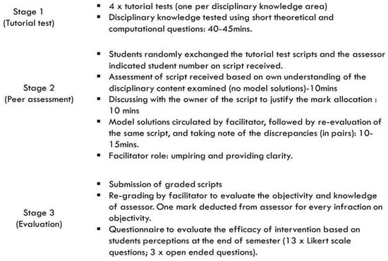 Peer tutorial assessment forms one of the variants of peer assessment that has received considerable attention in higher education [5,7,9,10,11,12]. By their nature, tutorial-based assessments are an important platform for providing feedback and academic and personal support [2]. To date, several studies have highlighted the importance of reciprocal peer support, in the form of reciprocal peer tutoring, in tutorial based assessments. In fact, reciprocal peer tutoring (RPT) is a form of collaborative learning that involves students of similar backgrounds experiencing interchanging roles of tutor and learner [5,14,15,16,17]. Fantuzzo et al. [14] proposed that reciprocal peer tutoring results in higher academic and psychological adjustment through mutual assistance strategies between the tutor and the tutee. The findings from the studies highlighted above necessitated the need to further explore the opportunities to enhance students’ disciplinary learning using reciprocal peer tutorial assessment (RPTA) as an instructional and assessment strategy. The RPTA, a variant of reciprocal peer tutoring, is defined herein as a teaching and learning strategy wherein individual students, or groups of students, assess the tutorial submissions and/or tasks of their peers with or without the assistance of the course facilitator. Falchikov [7] proposed the benefits of peer feedback marking as an opportunity to provide feedback and identifying strengths and weaknesses in students’ submissions. Eva [9] highlighted that the prolonged interaction among students in a tutorial-based assessment was beneficial to self-directed learning and identifying competency areas. In earlier studies, Gray [12] reported on a study involving two-stage peer marking of an engineering examination, with and without model answers. By comparing the discrepancies in the marks allocated before and after the distribution of model of model answers, the study provided the students with opportunities to constructively and critically become aware of the subject matter and the communication aspects in examinations [12]. Thus, the RPTA approach is potentially a powerful collaborative learning tool that can catalyse the ability of students to master knowledge areas in stages, learn from their successes and mistakes, and build disciplinary self-efficacy as they progress through knowledge requirements of the course. Furthermore, RPTA can also be considered to be a panacea to effective assessment and rapid feedback in large classes [4,7,11,12,18].