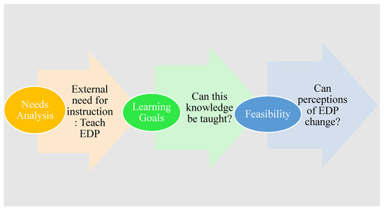 This study utilized qualitative research to answer the research questions. The framework is of an interpretivist, constructivism theoretical perspective [35]. This study used a subjectivist lens to describe individuals’ beliefs and perspectives about a knowledge domain. The methods included the purposeful sampling of a homogeneous group of secondary science preservice teachers taking a capstone course entitled secondary science methods. Data were collected by open-ended written questionnaires and analyzed by textural analysis. The researcher’s role was detached, as no conversations occurred while the participants completed the questionnaire. Participants produced the data individually on the questionnaire but had opportunities to discuss and plan for secondary science engineering lessons in the course. This study offers pragmatic validity [35], and readers might find pragmatic validity by determining if the results apply to other learners in other contexts. Learner analysis fits into a general instructional design paradigm termed ADDIE, which stands for Analysis, Design, Development, Implementation, and Evaluation. Instructional design models follow this overarching paradigm, illustrated in Figure 3 [36]. This study fits into the early stages (A, or analysis) of the instructional design process. Participants described perceptions relevant to their epistemology (learner analysis) and prior knowledge and beliefs (task analysis), which is based on experiences and conceptions regarding EDP and teaching engineering [5]. This study determined if a need for instruction existed for teaching engineering and if instruction was effective at changing participants’ perceptions. By examining and decomposing prior knowledge and beliefs about EDP and teaching engineering, designers may analyze nuances and changes in understanding, which could focus and direct instruction more effectively [5]. The results from this study can help inform future steps of the instructional design process.