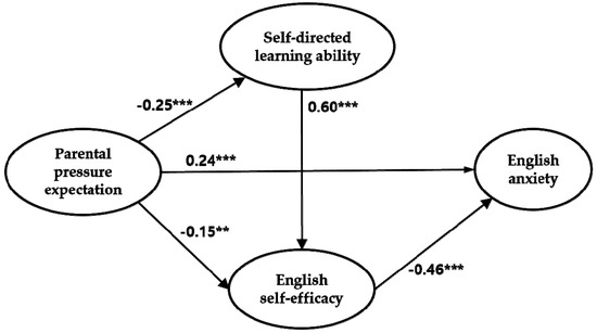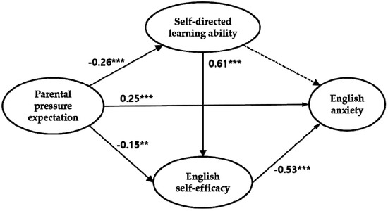 Third, the indirect effect of parental pressure expectation to English anxiety through self-directed learning and English self-efficacy was found to be significant. That is, parental pressure expectation had a significant effect on English anxiety, first by having an impact on self-directed learning, then on English self-efficacy, and finally on English anxiety, and this path of relationships was found to be significant. In this process, self-directed learning—the mediator variable—had a significant impact on English self-efficacy, another mediator variable in this study. The finding was consistent with a previous study that found that parental involvement negatively affected the self-directed learning ability of middle school students [33]. These results can be seen as being similar to the results of the previous studies [13,14], which showed that the higher the level of self-directed learning, the higher the level of academic self-efficacy.