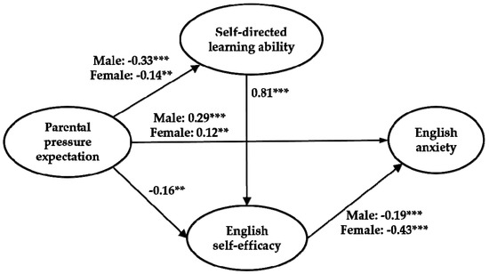 Lastly, the indirect path from parental pressure expectation to English anxiety through self-directed learning and English self-efficacy was found to be significant. Parental pressure expectation was negatively associated self-directed ability (Male: B = −0.33, p < 0.001, Female: B = −0.14, p < 0.01), which in turn was positively associated with English self-efficacy (B = 0.81, p < 0.001), and which in turn was negatively associated with English anxiety (Male: B = −0.19, p < 0.001, Female: B = −0.43, p < 0.001). These results showed that as the parental pressure expectation became higher, the level of self-directed learning ability decreased. Additionally, as self-directed learning became lower, the level of English self-efficacy decreased, and as English self-efficacy became lower, the level of English anxiety increased.
