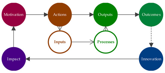 Universities are the center of the knowledge society. In fact, the link between universities and society and the organization of this around the abstract and universalized understanding of the world that universities provide are distinguishing features of the knowledge society [4]. The role of universities in stimulating innovation has long been accepted [5], bringing new ideas to society and being an integral economic engine. Figure 1 relates the sequence for the innovation process. Multiple factors and motivations that yield actions instigate innovation. These acts usually involve making inputs and driving research, development, production and distribution. Because of this, their outputs emerge as new knowledge and inventions, submit into outcomes as endeavors or enterprises, and impact on the promotion of more innovation activities.