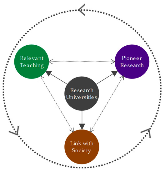In summary, research universities serve the progress of society, solving its problems, threats, opportunities and/or needs [17]. Research universities are challenged to become the engine of transformation of society [18], recovering the original concept of the university as an institution of generation, tutelage and dissemination of knowledge [19]. International rankings such as the Academic Ranking of World Universities, Scimago Institutions Rankings, Center for World Global Universities Ranking, University Ranking by Academic Performance or the Ranking Web of Universities, among others, consider these aforementioned characteristics. In fact, if these are taken into account, then universities can lead to an improved position in rankings [20].