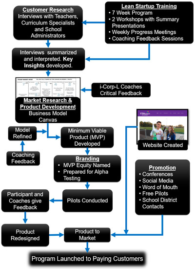 In this paper, the authors present their experiences from participating in a National Science Foundation (NSF) I-Corps L training program established for business startups, using Blank’s Lean LaunchPad, Osterwalder’s Business Model Canvas, and associated tools. They used the entrepreneurial skills acquired through this training to scale-up their emerging innovation, the Cincinnati Engineering Enhanced Math and Science Program (CEEMS), which had been developed, implemented, and evaluated with successful results over a period of seven years in a targeted 14 school-district partnership in Greater Cincinnati. The overriding goal was to improve student learning and success rates in K–12 math and science courses by helping to accelerate the process of bringing effective educational innovation, CEEMS, to scale. In CEEMS, teachers were trained in using challenge-based learning (CBL) and the engineering design process (EDP), teaching pedagogies to transform their classrooms into student-centered, hands-on learning environments, while also assisting students to improve their evaluation scores related to science, math, and engineering instruction. CEEMS teachers acquired the necessary skills through coursework, professional development (PD) workshops, and longitudinal professional guidance provided by assigned coaches over a period of two years to become proficient in developing CBL–EDP curriculum, teaching it, and assessing student learning and reflecting after teaching. The authors have documented how they used customer market research conducted during the I-Corps L training to define their minimum viable product (MVP) to duplicate the successful CEEMS methodology through a condensed (≤16 week) self-paced, completely online training program with virtual coaching support. The authors also describe the process they used to move forward very quickly from an MVP to a more complete product offering, its branding, the process of trademarking it, and finally licensing it to an established non-profit organization (NPO) for future marketing. Details of the whole experience are presented with the hope that it will serve as a useful guide for other venture creators.