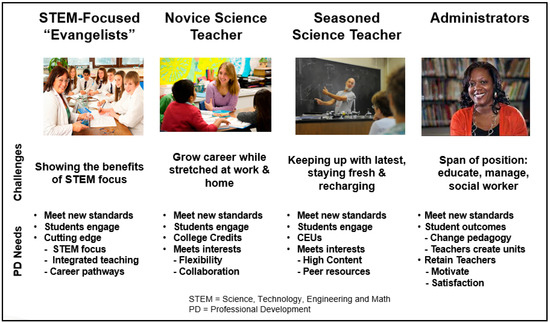 Understanding who the customer is and what their needs are was the most important part of the process. Initially we believed that our customers were middle and high-school science teachers, much like those science teachers that attended the CEEMS program at the University of Cincinnati. Although these are important customers, they were not the only customers. Through our customer research we found four different customer types, also referred to as a “customer archetype”. The four archetypes identified were: (1) STEM-focused Teachers and Admin “Evangelists”, (2) Novice Science Teachers, (3) Seasoned Science Teachers, and (4) School and District Administrators. It is worth mentioning again that during the I-Corps L training we limited our customer base to secondary-school science teachers and the decision makers who have an impact on their professional development (e.g., administrators, curriculum directors, etc.). Later this was extended to include K–12 in-service math and science teachers across elementary school to high-school grade bands. Each of these customer archetypes have their own unique set of motivations, pain points, and professional development needs that influence their purchasing decisions with respect to professional development. Through our customer research and coaching feedback, we identified those unique needs, which are summarized in Figure 4.