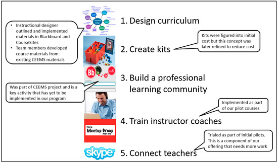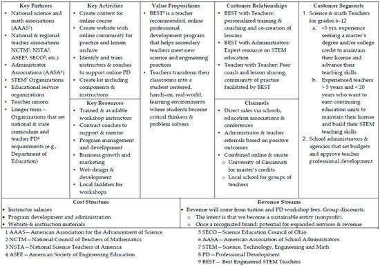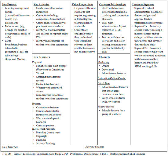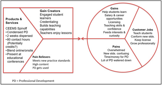 During the fall of 2014, NSF awarded a supplement award, I-Corps: Training Teachers to Use Engineering as a Context for Learning (NSF grant #1518619), to a select group from the CEEMS project team. As part of this award, the team participated in a seven-week course of study, along with about 20 other exemplar projects, in order to learn how the business-model design and customer development process can be used to evaluate the sustainable scalability potential of their educational innovation. The participating exemplar projects were selected by the NSF program officers from three directorates: Education and Human Resources (EHR), Computer and Information Science and Engineering (CISE), and Engineering (ENG). The facilitators and coaches for the course included a team of an NSF program officer, business entrepreneurs, university faculty, and industry experts. The training course utilized a Lean Startup [67] methodology which assumes that all you have is a series of untested hypotheses—basically, presumptions about the validity of one’s educational innovation idea. The three parts to this methodology include the following: (1) a process of hypothesis testing using a business-modeling tool; (2) “getting out of the building” to test these hypotheses with prospective clients; and (3) the use of agile development [68] to rapidly iterate the product being developed.