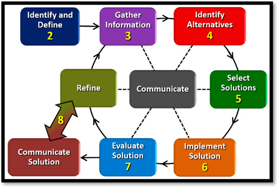 The CEEMS CBL approach [46,47,48,49,50,51] has its roots in the seminal work freely disseminated by Apple, Inc. [52]. In this version of CBL, students begin with a big idea, such as public health. They collaborate in teams to generate an essential question, offer insight on how that big idea relates to it, and the class as a whole then state it as a challenge that they would like to solve. After the challenge is defined, the entire class generates guiding questions that need to be answered. Student teams seek to find answers to the guiding questions by participating in a variety of learning activities, conducting research, learning new material (independently, in groups or as part of a teacher-led lesson), performing experiments, interviewing, and exploring various avenues to assist in crafting the best solution to the challenge. CEEMS adds a twist by requiring that the challenge be solved using the EDP. By synthesizing CBL and the EDP, teachers use the challenge to get students engaged and interested in the problem and then guide them to use the EDP to seek out multiple solutions. Put simply, the EDP is a series of steps that engineers follow to devise solutions for problems. More details about the EDP are presented later in this paper. However, the nature of the EDP is inherently flexible because there are constraints, trade-offs, and performance objectives for any challenge or problem that make a variety of potential solutions available. As such, the EDP is an iterative process that requires constant revision and optimization. Using prior knowledge and experiences, students identify the best alternative and implement the most efficient solution. Finally, student teams share their solution to the challenge using one of many possible formats such as oral presentations, written reports, marketing flyers, videos, and other creative means.
