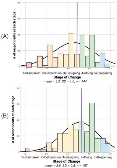 The main finding relevant to our research question was that teachers reported strong, medium-sized, statistically significant changes over the prior year for all PBEE core practices. The magnitude of change pre- to post- was approximately a half a standard deviation (see Cohen’s d in Table 1). On average, this represented a move from a little above “Designing” to a little below “Doing” on the Stages of Change scale (Figure 1).