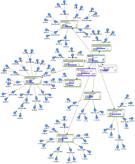 The Bayesian paradigm was selected as it is a sound methodology for modeling students’ performance and knowledge, and it was used in research even before the 21st century by the developers of adaptive learning applications such as Collins, Greer, and Huang [36], Conati, Gertner, VanLehn, and Druzdze [37], Jameson [38], and VanLehn, Niu, Siler, and Gertner [39]. As these researchers were also the developers of their respective adaptive learning systems, they most probably had privileged access to knowledge into the inner workings of the algorithms. In contrast, the approach outlined in the current paper enables educational stakeholders to perform independent descriptive analytics, as well as predictive simulations, using the performance data downloaded from the back-end reports of an AI-ALS. This paper presents a detailed BN model of the students’ knowledge that can inform educational stakeholders about the specific mathematics topics the students are ready to learn, and the topics they already passed. Teachers may use this vital information depicted by the relationships between the nodes/variables in the BN to provide remediation for the students who are struggling in their studies, and to help students who are attaining average-level scores in the AI-ALS to improve their learning experiences so that they could hopefully be more engaged and achieve high-level scores (higher percentage in the mathematics topics passed).
