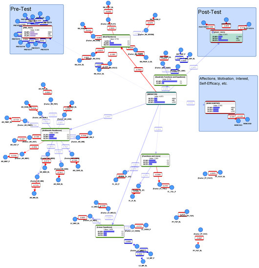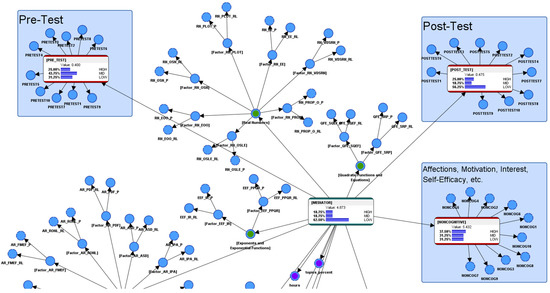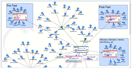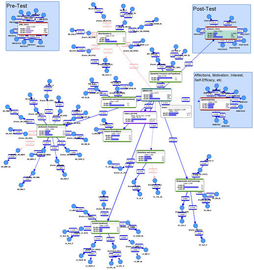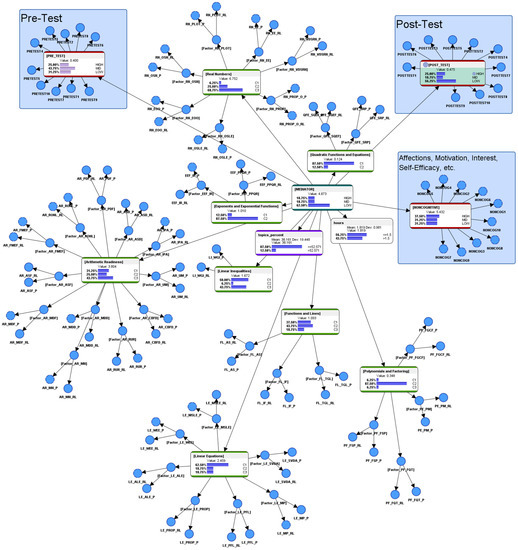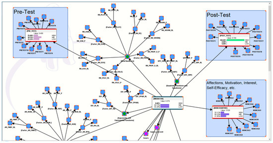 The initial hypothetical conjecture of the researcher was to assume that an AI-ALS might have been designed by its developers to push the higher-performing students a little harder, and conversely, to go easy on the relatively lower-performing students. Therefore, it would not be unreasonable to imagine that a student who performed poorly in the AI-ALS might have experienced having his or her weaknesses being educed by the system. Subsequently, after a personal reflection of those problems via vicarious trial and error (VTE) [43], the student could become cognizant of those weaknesses and could avoid similar predicaments during problem-solving in the paper-based post-test. Conversely, a student who performed well in the AI-ALS might not have experienced having his or her weaknesses educed and, thus, might lack the personal reflections or the VTE to learn from those experiences. Consequently, he or she might perform poorly in the post-test. Regardless of whether a student scored high or low within the AI-ALS, this BN purely profiled its informational pattern (its motif). In other words, it does not affect the calculation of the “gains” attributed to the AI-ALS, as it is not simply a subtraction of the results of the paper-based post-test from the paper-based pre-test.
