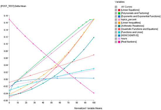 As observed in Figure 5, the plots of the total effects of the various mathematics topics on the target node (the paper-based post-test) suggest that, with the exception of real numbers, there are positive linear or curvilinear relationships between the students’ performances in the mathematics topics in the AI-ALS and the total effect on the paper-based post-test. The results imply that the total effects of mastering the foundational real numbers in the AI-ALS on the paper-based post-test declines as the students spend more effort and time on learning the other mathematics topics. In other words, it could be interpreted that, as the student progresses in the AI-ALS, the marginal utility (to borrow a well-known term from economics) of mastering real numbers decreases, while the marginal utilities of the other mathematics topics continue to increase.