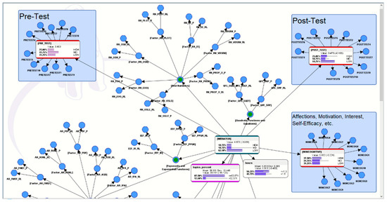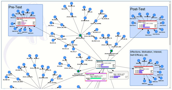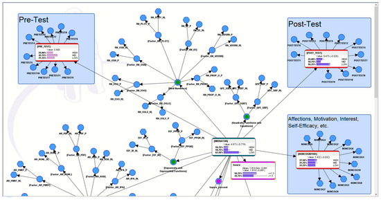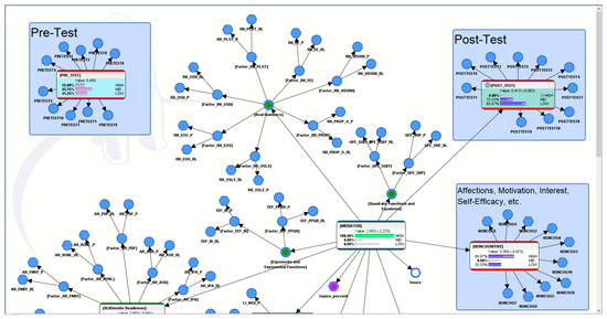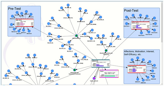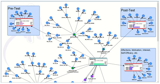 In this computational model (see Figure 2), the pre-test results (from a paper-based math worksheet) were connected to the profile of the AI-ALS and, subsequently, the profile of the AI-ALS was also connected to the post-test results (from another paper-based math worksheet). This enabled the probabilities of the AI-ALS as a mediator of the students’ performance to be calculated, subsequently allowing us the ability to simulate hypothetical scenarios (presented later in Section 5).