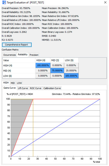 As observed in Figure 18, the results were good. The overall precision was 93.7500%; the mean precision was 96.2963%; the overall reliability was 95.3123%; the mean reliability was 91.6667%; the overall relative Gini index was 98.1055%; the mean relative Gini index was 97.9218%; the overall relative lift index was 100%; the mean relative lift index was also 100%; the overall receiver operating characteristic (ROC) index was 100%; the mean ROC index was also 100%. The overall log-loss was 0.2062; the mean binary log-loss was 0.1374, which was quite good as log-loss should be as close to zero as possible, since it measures loss of information in the prediction; the linear correlation coefficient R was 0.9629 and could be considered to be very good relationship between the variables (the scores in the AI-ALS and the target scores in the paper-based post-test); the coefficient of determination R2 was 0.9273 and could be considered to be very good as it measures the strength of the linear association between the scores in the AI-ALS and the target node (the scores of the paper-based post-test); the root-mean-square error (RMSE) was 0.0400 and its low value could be considered to be good since it measures how far the data points were from the regression line; the normalized root-mean-square error (NRMSE) was 11.5151% and could be considered to be acceptably good since it was quite low in value.