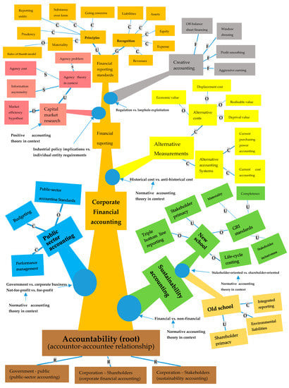 Figure 2 is the product of the tree-like concept map for the curriculum of Accounting Theory. In the figure, accounting theories and concepts are modeled into a tree. Located at the root is accountability, which represents the foundation of accounting practices. The accountability root buttressed the financial accounting trunk (main branch) and the branches of public-sector accounting and sustainability accounting. This layout visualizes the theory that accountability underlies all accounting phenomena, and different accountor–accountee relationships regulate various sector-specific accounting practices [33,42,46,47,48]. The bifurcation signposts indicate the difference between accounting sectors (branches), academic schools and streams (twigs), and sector-specific standards, principles, and practical models (sub-twigs and lower-level sub-twigs).