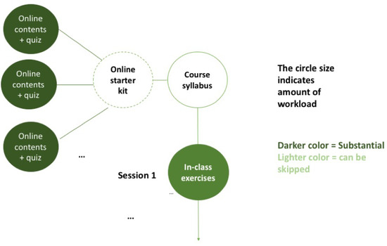 The teachers for this course can use a blue-print structure composed of sessions with online contents to watch before the class and assignments for each module that students perform in class. Usually students have additional readings to do after the class. The sessions of the blue-print are the following ones: