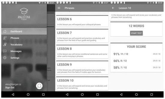 Therefore, the newly developed smartphone app (Figure 1) was targeted at and tailored to the development and revision of novel English vocabulary. There were ten parallel lessons of vocabulary and phrases. The content of the lessons was physically completed with words and phrases by the teacher, and the students had to translate the word or the phrase from their native language into English. Each lesson was done as a test and consisted on average of 15 new words and 10 new phrases. The selected words and phrases were those discussed in the face-to-face classes and focused on their field of study, i.e., tourism, the topics generated by the needs analysis at the beginning of the course.