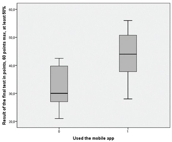 Thirdly, a method of continuous assessment conducted throughout the whole course was used when using the mobile app. Finally, methods of analysis and evaluation of the results of students’ achievement tests (taken by all 31 students), including a statistical analysis, were used, as well as a comparison of the findings with the similar research studies was performed. The pass mark for the final achievement test was 50%, i.e., 30 points. After the final test, the students who used the app were also asked to fill in a short evaluation questionnaire concerning the use of the mobile app and their study behavior. This questionnaire was based on the study by Lameris et al. [25].