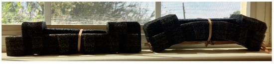 Prestressed plastic foam using rubber bands (on right) versus regular plastic foam beam (on left).