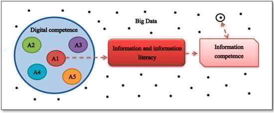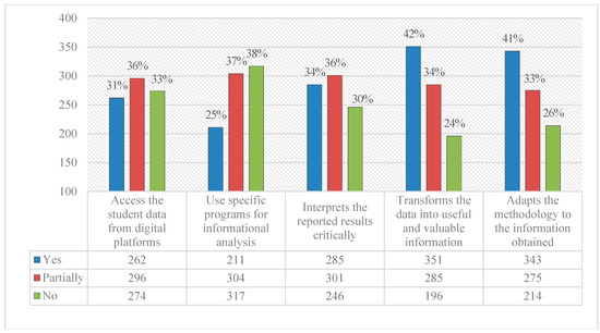 Despite this, to take advantage of the potential of Big Data in education, it is essential to have informational competencies, alluding to Area 1 of the digital teaching competence [60,63], in order to have skills to locate, access, analyze and interpret the data [64,65,67]. With the necessary skills, it is possible to generate new, valuable and useful information that facilitates critical decision-making [66] and has an impact on effective strategic action by teachers, thereby improving the quality of teaching and learning processes [58]. In all of this, digital competence plays a fundamental role, making it essential for all teachers to have an adequate level to perform analytical practices using large volumes of data, especially in the area of information and information literacy, in its three dimensions.