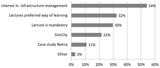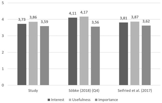 To assess the students’ motivation, it is important to know the students’ expectations and values about the courses. If, in extreme cases, the students are only interested in the credits, but not in the subject-related content of the course, it is difficult to convey subject-related content even with motivational games. With the help of the Expectancy-Value Model [54,55], students’ expectations and values can be measured. It could be ascertained that the students—ideally—are primarily interested in the contents of the course. Thus, the Expectancy-Value Model measures how much interest students have in subject-related content (“Interest”), to what extent subject-related content is regarded as useful (“Usefulness”) and how important subject-related content is (“Importance”). Figure 2 shows the results and compares them to two previous studies, both of which indicate students being mainly interested in subject-related contents. The values measured in this study are in the same range and present students interested in the subject-related content. This finding is supported by the reasons for participating in the course visualized in Figure 3: interest in the subject-related content is the dominant reason for participation with 54% of the respondents mentioning it.