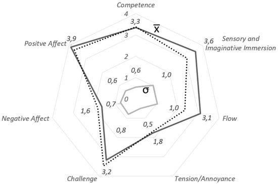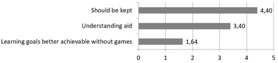 It can be assumed that intrinsic motivation is very important for the success of game-based learning activities and that intrinsic motivation is present when the game-based learning activity is perceived as a game experience. Therefore, the in-game variant of the Game Experience Questionnaire (GEQ) [58] was used to measure the game experience. Figure 4 shows the results. The high value of the category Positive Affect and the low values in the categories Negative Affect and Tension are typical for a game-like experience. The lower values in the categories Competence (i.e., the players do not feel sufficiently prepared to solve the problems of the game) and Challenge (i.e., these problems do not seem to be perceived as a big challenge either) could reflect the doubts of the students as to whether the content conveyed with the help of the game has the necessary complexity to be transferred to reality. This doubting effect is not unknown from discourses of teaching and learning research: learning is always associated with an activity “that has to make an effort in order to be successful”. This is contrary to the approach of game-based learning, in which the perceived effort of the students is, at least partially, compensated by their intrinsic motivation. In comparison with a study in which quiz apps were used asynchronously [59], i.e., interrupted again and again in contrast to the didactic scenario of this study, the correspondingly higher values for the categories Flow and Sensory and Imaginative Immersion are noticeable.