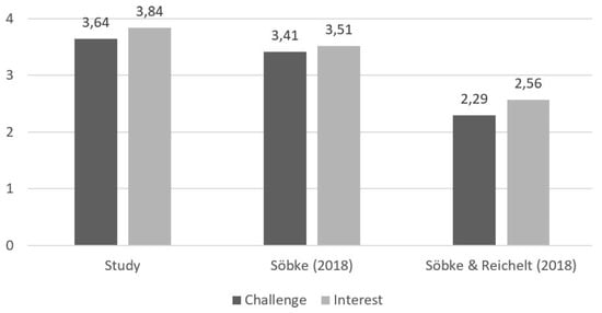 A further aspect of motivation is that of current motivation in learning situations, which can be measured with the help of QCM (FAM) [60]. To keep the acceptable size of the questionnaire, only the items of the categories Challenge and Interest were included in the current study. As Figure 5 shows, comparatively high values could be measured here as well.