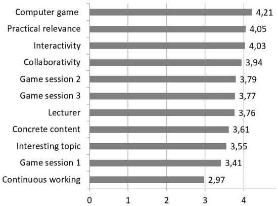 The design of the didactic scenario considerably influences the effectiveness of the game. Therefore, it is of interest to know the strengths and weaknesses of the didactic scenario evaluated in this study. For this purpose, the students identified the highlights of the didactic scenario by assigning a value to different characteristics of the didactic scenario on a Likert scale. The game itself was given the highest rating, followed by the practical relevance and interactivity of the didactic scenario and the cooperation of the students (see Figure 6). The gaming sessions 2 and 3 with free play were also rated better than the training gaming session 1.