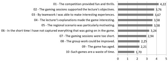 The survey of general assessments (see Figure 7) showed that competition between the groups was important for excitement and fun. The gaming sessions further supported the objectives of the didactic scenario. Group work was likewise praised (03) or felt that there was no need for improvement (08). The good explanations of the lecturer (04) and the regional scenario were noted positively (05). Interesting are also statements which did not receive approval: games like SimCity are not considered a waste of time (10). Similarly, the aged game is not seen as outdated (09). However, time pressure has prevented the simulation model from being understood in all interdependencies.