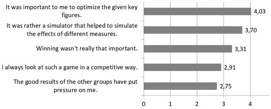 The undoubtedly existing time pressure during the time-limited gaming sessions leads to the question of the goals of the gaming sessions. Figure 8 shows that the most important goal is the achievement of the assessment criteria defined in advance. It also becomes clear that competition between the groups has created tension but has not led to unhealthy pressure.
