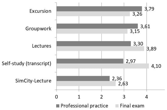 Overall, the picture of the SimCity didactic scenario was quite positive, but it was interrupted at one point when students were asked about their preferences for different learning activities of the course in terms of final exam and professional practice. For the final exam, the transcript of lectures was considered most important. For professional experience, excursions were considered the most useful. In both cases, the SimCity lecture is considered the least important, which may be related to the general terms used for the other learning activities. However, it is likely also a consequence that “playing” is not yet socially recognized as a learning activity.