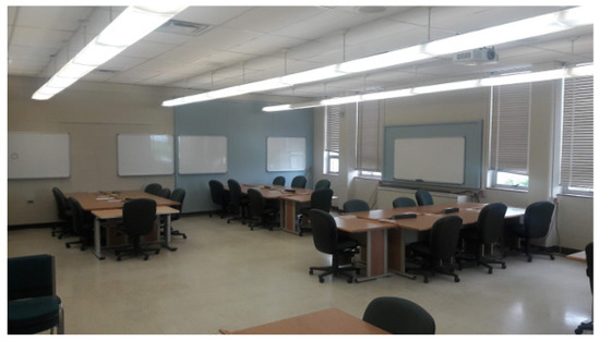 Figure 3 show the classroom before the retrofit and with the PALS system in place, respectively. This economy space, along with a prototypical ALC and a regular classroom, were used in a CS2 course (i.e., an introductory computer science course focusing on data structures and object-oriented programming) at a Midwestern university. Over the course of two semesters, two interventions were performed, with one pairing the PALS classroom with a traditional classroom and the other pairing the PALS classroom with a prototypical ALC. The same instructor taught both interventions and made use of a group-based, active learning pedagogy. Due to constraints imposed by course registration, the sections involved in the study were offered at different times of the day and different numbers of enrolled students. Reported here are results specific to student perceptions of these spaces and not student performance. The study was approved by the Institutional Review Board of Central Michigan University.