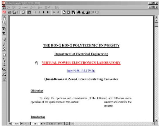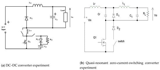 Two experiments were developed, namely the DC–DC converters experiment and the resonant zero-current-switching converter experiment [29], the performances of which were evaluated. Figure 2 shows the circuits of the two experiments. The two experiments are fundamental power conversion tests for power electronics circuits. The first one is to examine the DC voltage to DC voltage power test. The output voltage Vo can be regulated by the transistor Q1′s switching condition. The circuit also examines the parasitic inductance LS and snubber formed by C2, D2, and R2. Students can study the circuit operation with or without the parasitic unit. The waveforms of the inductor, and transistor switching condition are recorded by the VPEL and are delivered to users via the internet. Students can then examine the waveforms in order to study the effect of the duty ratio to the output Vo. The second one is to examine the resonant circuit for DC to DC power conversion. The study is to test the circuit operation under the resonance condition of inductor Lr and capacitor Cr. Inductor L1 and capacitor C1 are output filters. The switch’s function is to control the full wave or half wave resonance by allowing the resonant current to pass through the diode D2, which produces a full-wave resonant, whilst the resonance is half wave when the switch is turned off. During the resonance, the transistor current is under a sinusoidal manner, and therefore, the inductor current is recorded to observe this phenomenon. Through these two experiments, students will understand the power conversion of two large circuits in the DC–DC power conversion learning.
