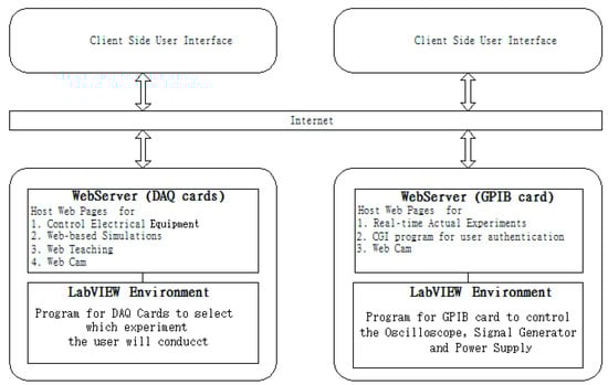 Figure 6 shows the software design of the VPEL that includes the serve side and client side. LabView activates the instrument control, and its internet-developer tool-kit facilitates the Web server. The cam pushes the live video to the client side through their IP upon the client’s request.