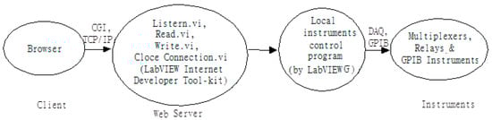 The CGI program then establishes a TCP connection with listener.vi by the G language on the computer and passes the parameters to listener.vi. The listener.vi on the PC turns on the local instrument control VI and passes the command string and parameter to the attached instrument. After that, the TCP connection will be released, and the CGI program returns information to remote side. The instrument control can be remotely made through the interfacing software.