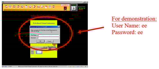 Figure 10. The logon page. - The experiment can be conducted any time: Simply click the “real-time actual experiment”, and a Login page pops up. A user is required to enter the login account name and password as part of the authentication procedure. This has been preprogrammed by the administrator.
